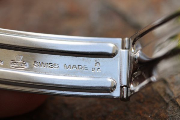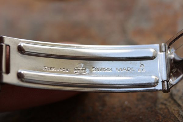 Bracelet is a Swiss rivet with spring loaded stretchable links in excellent condition. Claps is dated 1956.