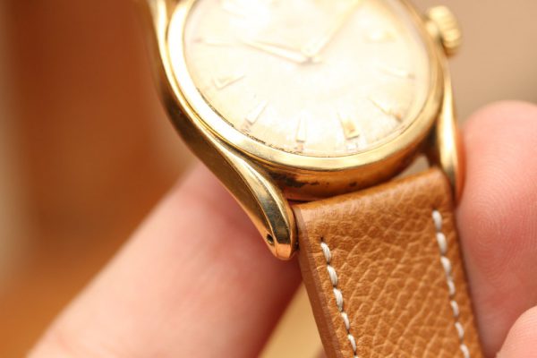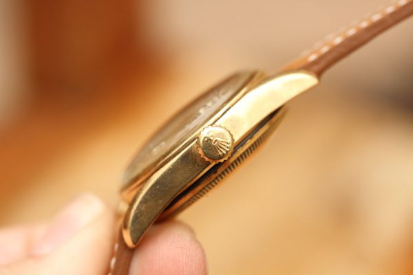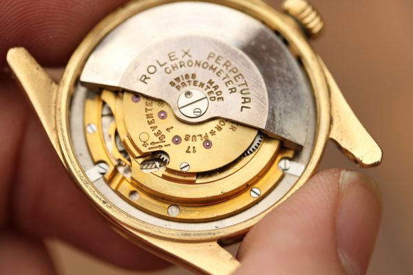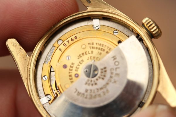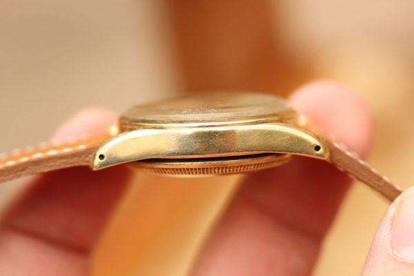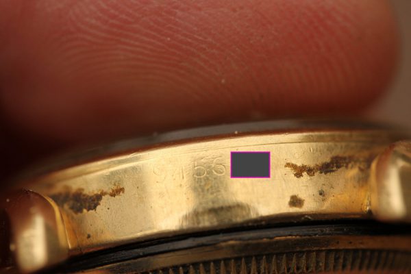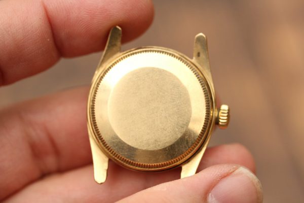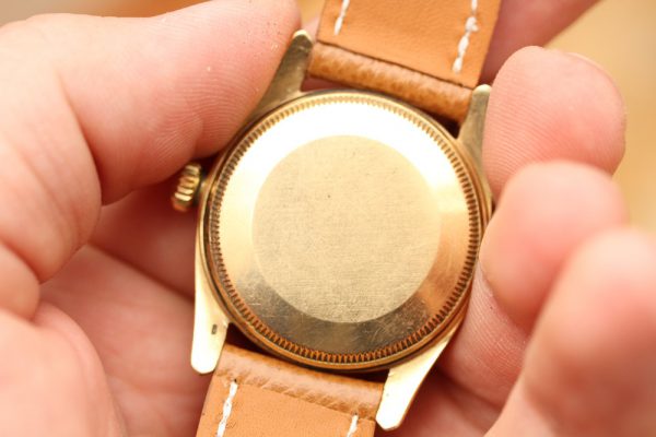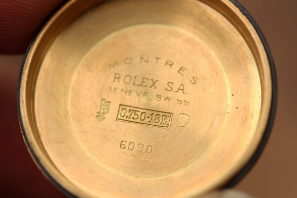 Original caseback is stamped with Rolex hallmarks, 18kt hallmarks, and reference 6090.