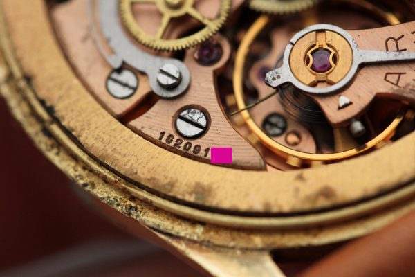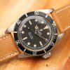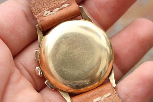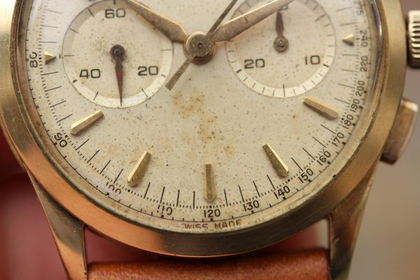 Dial is original with Tachymetre scale, off white with plenty of patina and signs of aging. The watch these flat pushers were design didn’t much prevent small particles, including moisture from coming in. This dial has attractive aged look and is original. Appears to be non-luminous from the factory, with no radium on plots and also solid hands with no luminous. Hands are Alpha style with leaf subdials hands and all appear original.