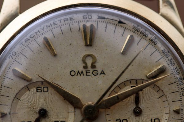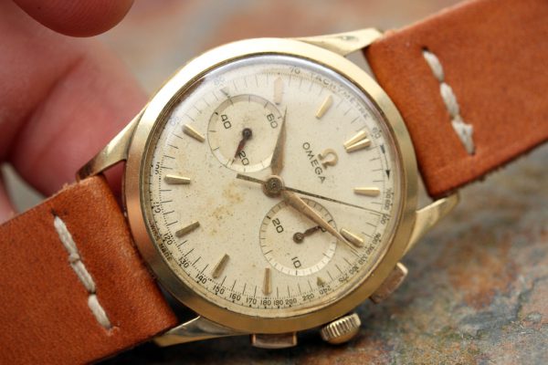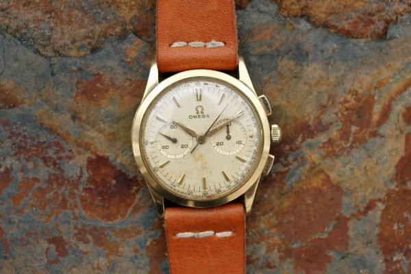 Up for grabs is an Omega Chronograph in 18kt yellow gold