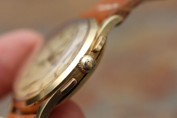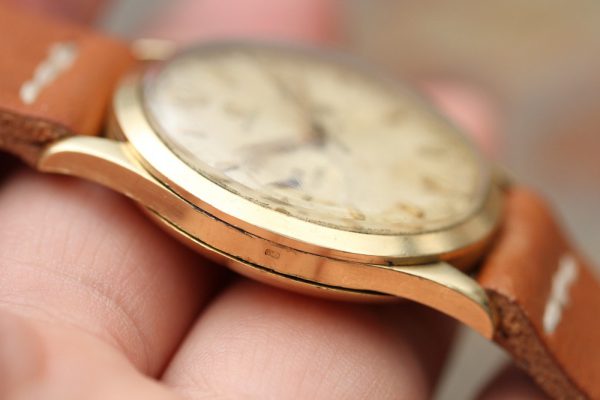 Case is in excellent vintage condition. Given its age and being made out of gold, it has kept very nice and sharp lugs and case. Omega signed winding crown.