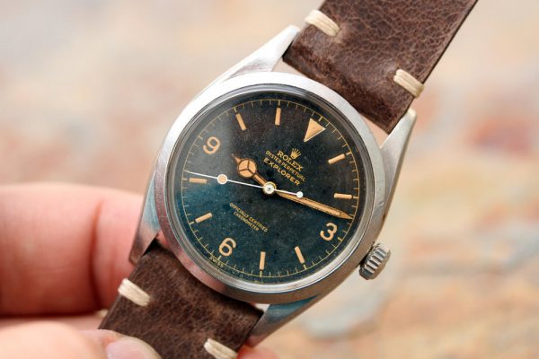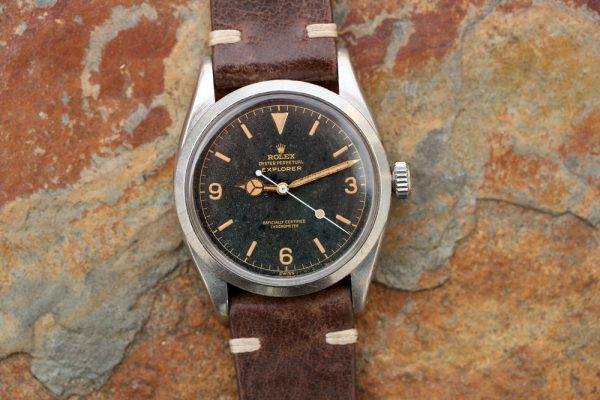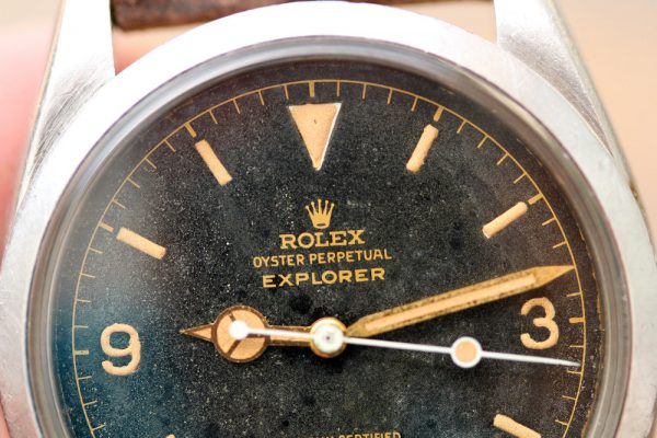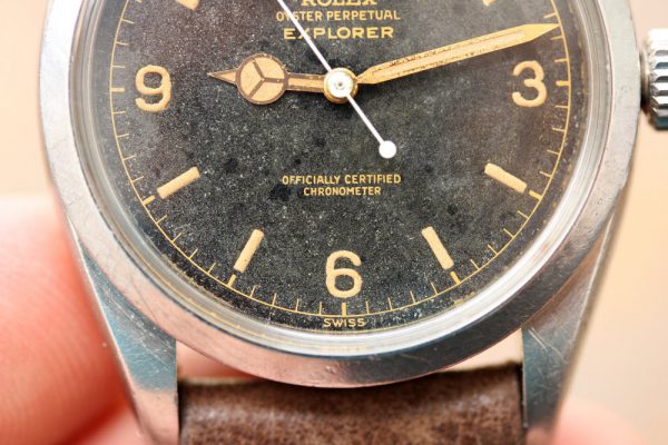 Dial is original, gilt, chapter ring with radium luminous. Extremely well preserved radium on plots and original gilt hands has aged to a very vivid orange patina. The dial’s glossy finish has matted out and aged to a very attractive gray color.