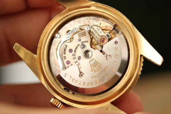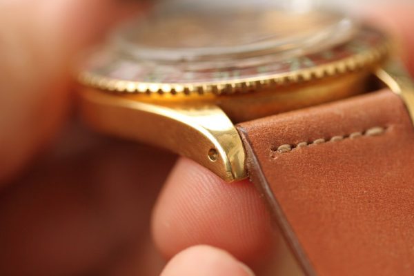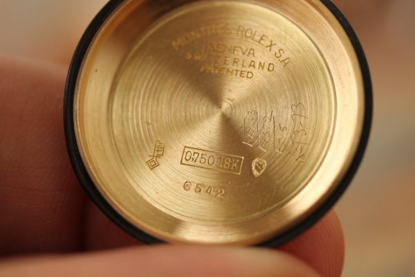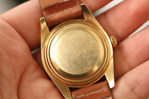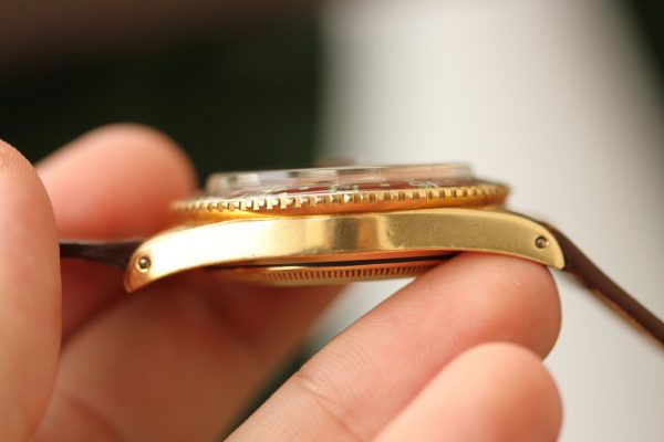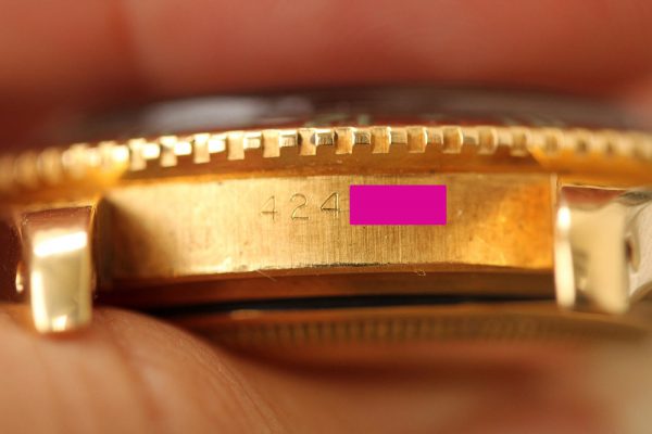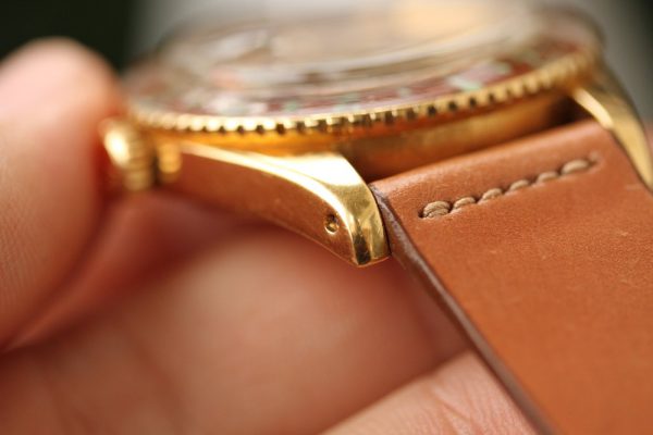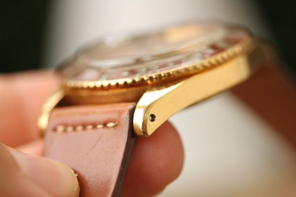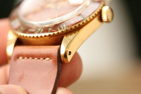 The case is in phenomenal vintage condition, especially for gold. The lugs are very thick, the original chamfers are clearly seen, the edges are very sharp. The top of the lugs seem to have “sleeve wear” with original brushed finish still barely visible. The numbers are extremely legible, there is no wear damage between lugs from bracelet, so it is believed the watch always been worn on strap during its life.