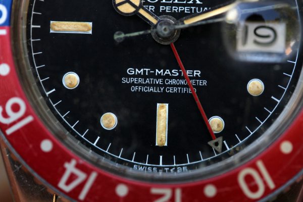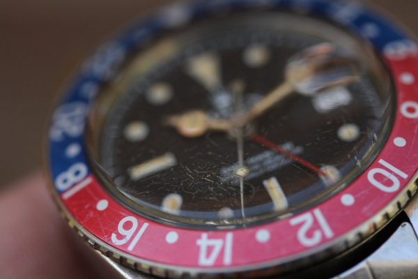 Dial is a matte service tritium with chapter ring, white print and nice patina on pots and hands. Original small GMT hand. Date disk with open 6’s and 9’s.
