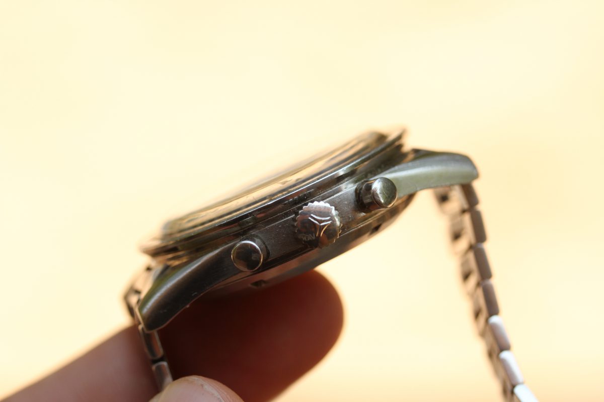 The watch is 99% fully original with only the winding crown have been replaced at some point. It is important to show this watch as found and presented as found. There are secondary parts, nothing has been swapped around to make it “better” than found. It didn’t come with wrong bezel and then swapped, it was found with this correct black BASE 1000 bezel, etc.