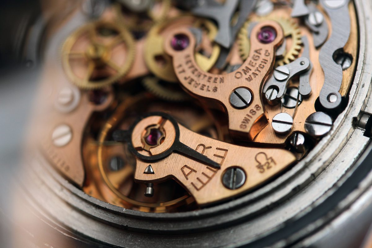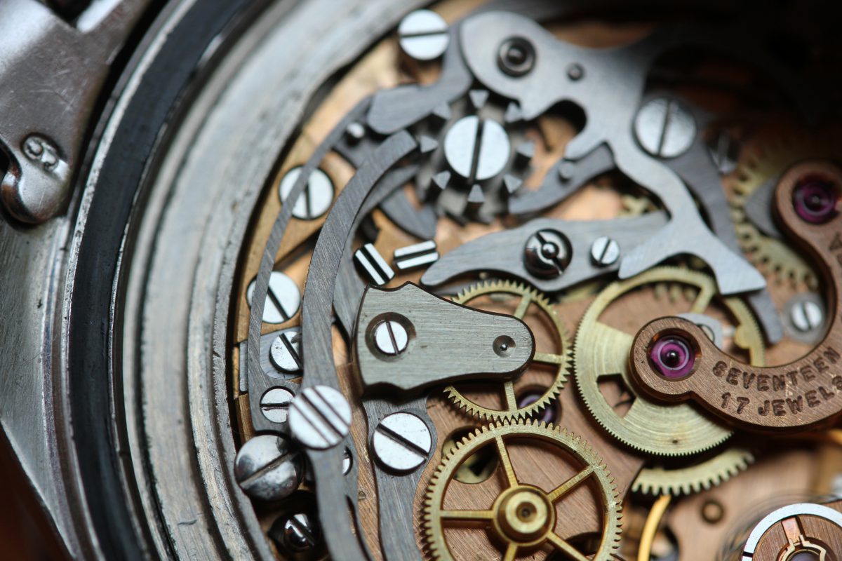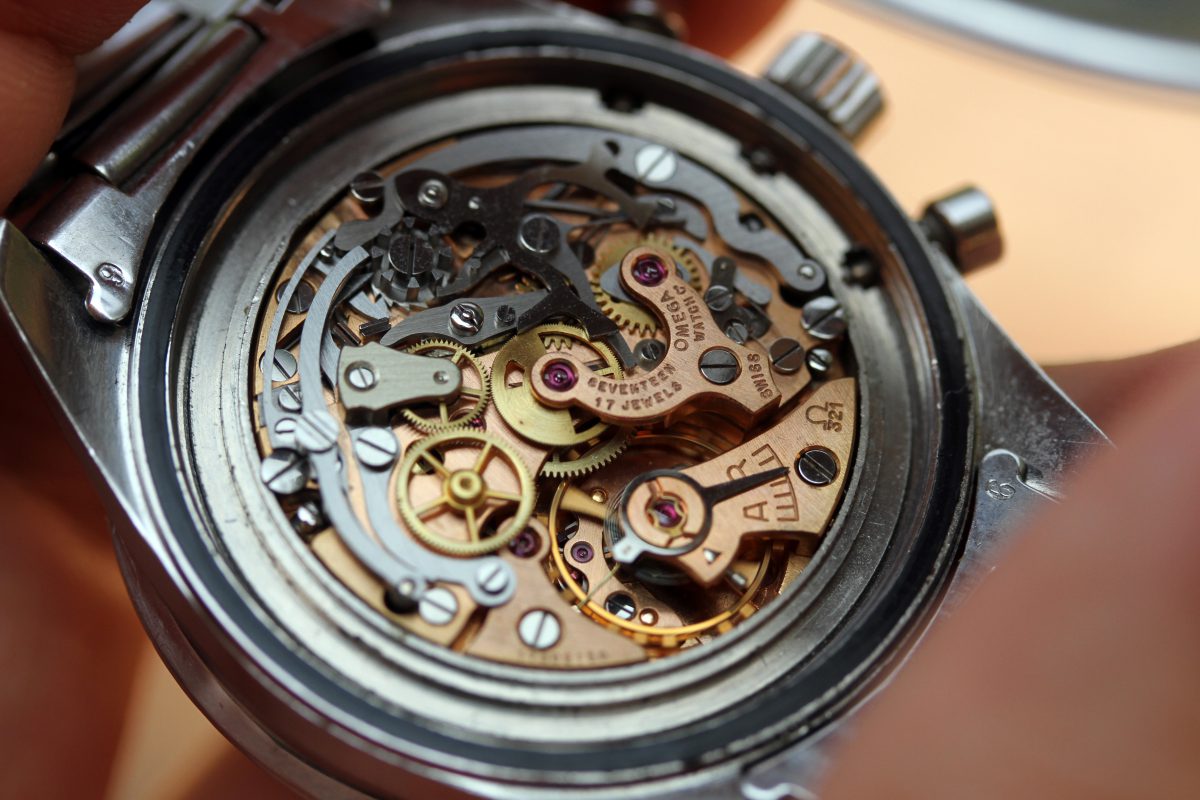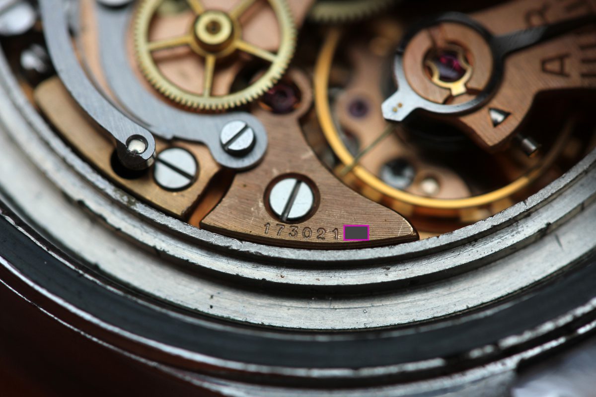 The movement is original and correct early caliber 321. It is important to note the symmetrical bridge and straight arrow adjuster which are only correct for early versions of cal. 321. The movement runs and winds smoothly. The chronograph engages, but when you attempt to stop it, it just resets. Again, presented as found without messing with the movement.