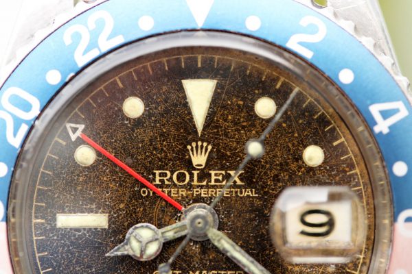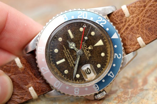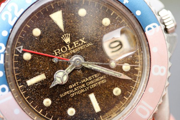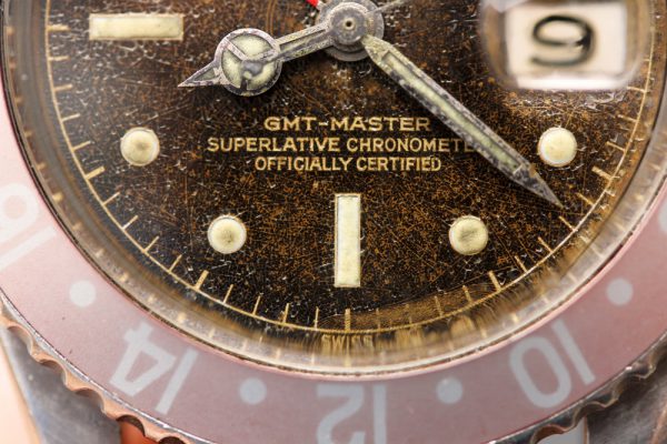 The dial is very attractive and original chapter ring, swiss only, with lacquer having to spider all over and turn caramel brown throughout. All lume is original and intact on plots. Hands appear original with mini GMT hand and original lume.