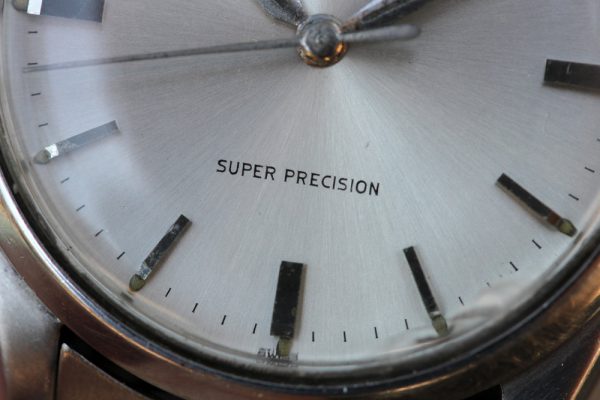 Dial is original Super Precision in silver color. SWISS only with dark colored lume on hands and plots. Hands are original, Dauphine Style.