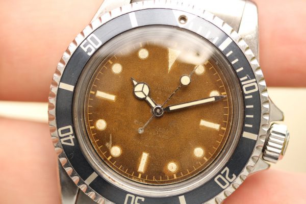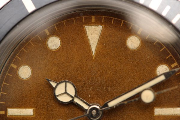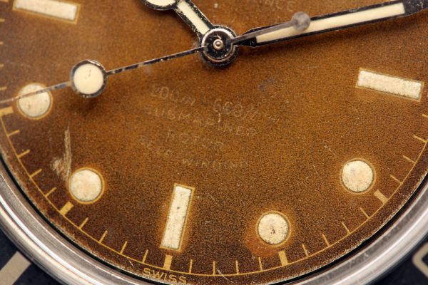 Dial is original, gilt, Chapter Ring, SWISS only that has aged to an extremely attractive honey brown or caramel in color. Please note there is a scratch on dial by 7 o’clock. Most of the luminous has flaked off from plots. The hands are color matched to the dial, with big lollipop Seconds hand.