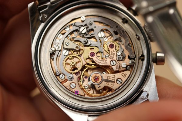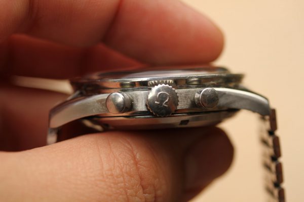 Nice strong case with thick and defined lugs. Skinny logo crown. Pushers appear original.