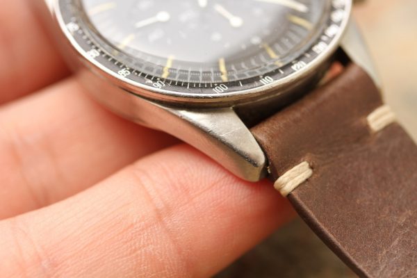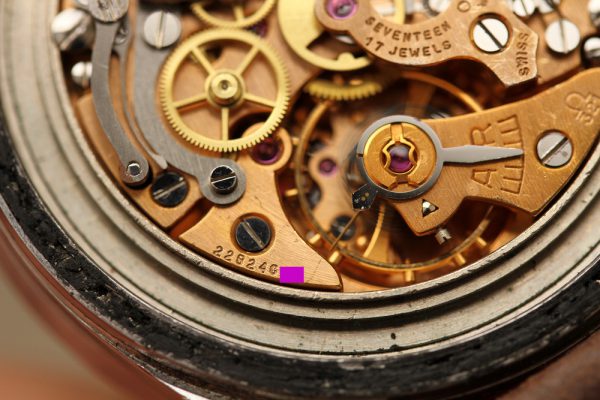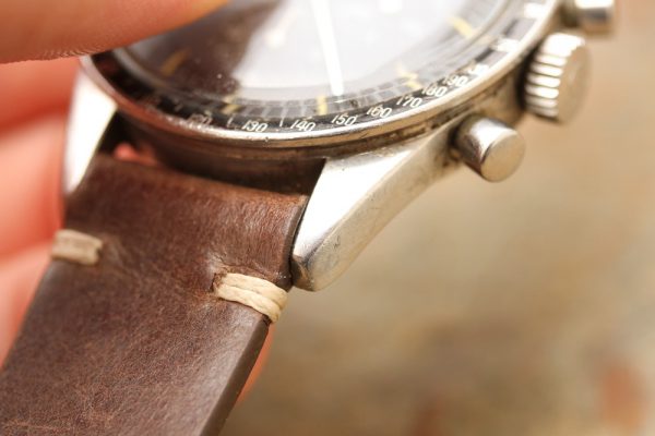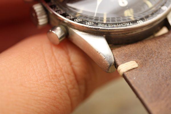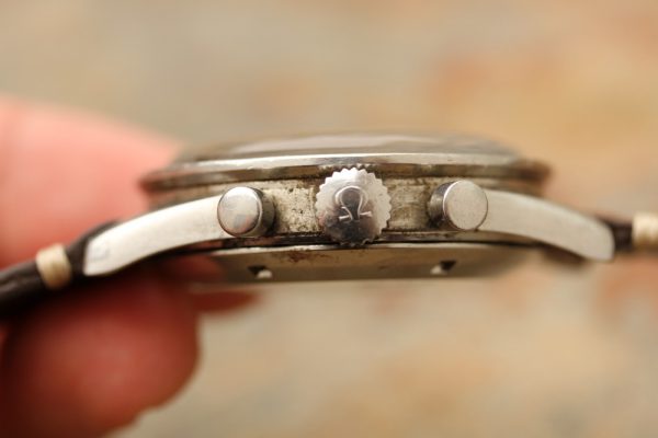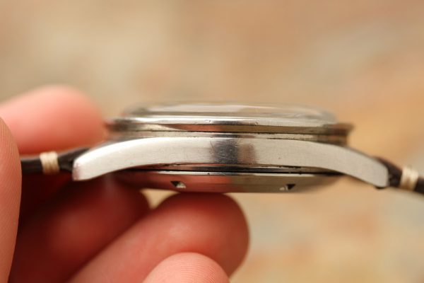 The watch is presented mostly as found, with dry rotted gasket and some dirt on case between lugs and pushers. The crystal had to be replaced as it was badly scratched and hazy from scratches, so this was done prior to taking pictures. The case will be cleaned up and the gasket will be replaced with a new one, but I wanted to present it as “as found” as possible. The generic steel bracelet which the watch came one has been discarded because of condition and overall look of it.