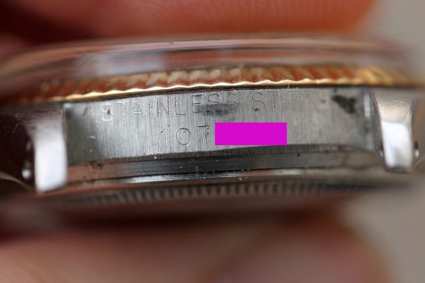Excellent vintage condition case without major dings or dents. No corrosion or pitting. Serial and reference numbers are clear and fully intact.