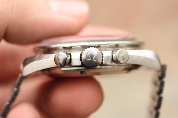 Original pushers and original skinny logo crown. The bottom pusher feel “loose”, but fully functioning. I wanted to keep the original low pushers, but can replace if requested before shipment.