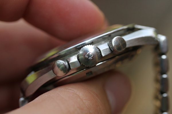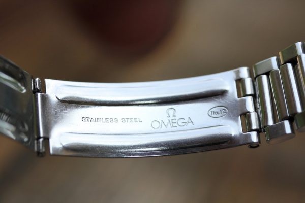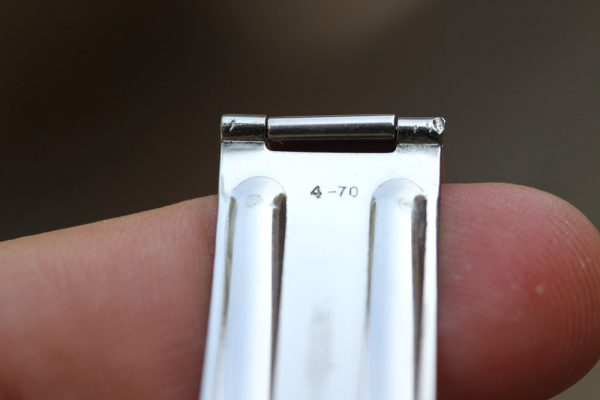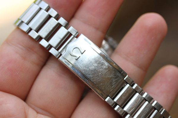Bracelet is an Omega “No 12” with brick links. Fits a full size wrist. One of the end-links is aftermarket replacement, other is original, stamped “47”. Date on clasp is 1970.