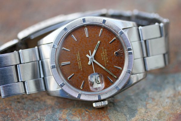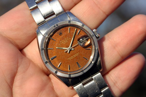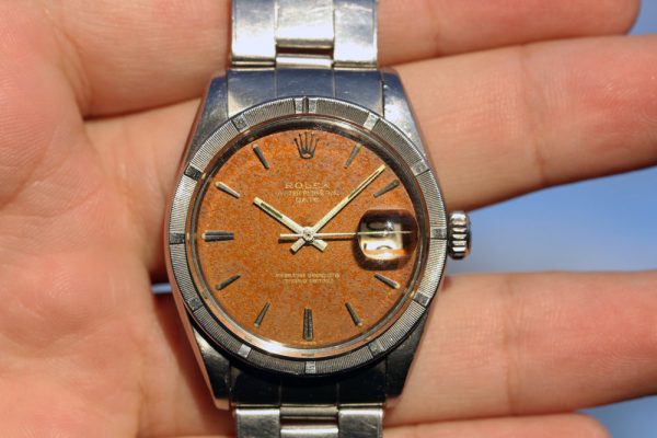 Dial is original, tritium with gilt print and has aged to a very intense caramel brown tropical color. All lume dots are intact. Hands are original. Date disk with open 6’s and 9’s.