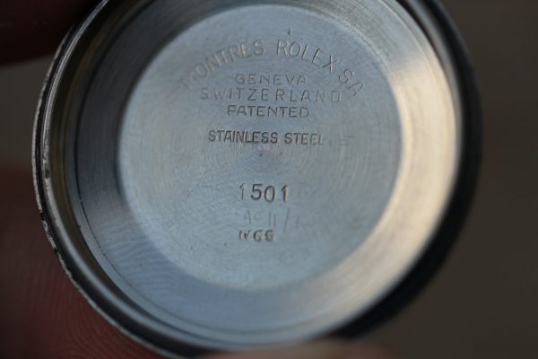 Caseback is original, with factory finish on outside. Stamped 1501 and IV.65 inside.