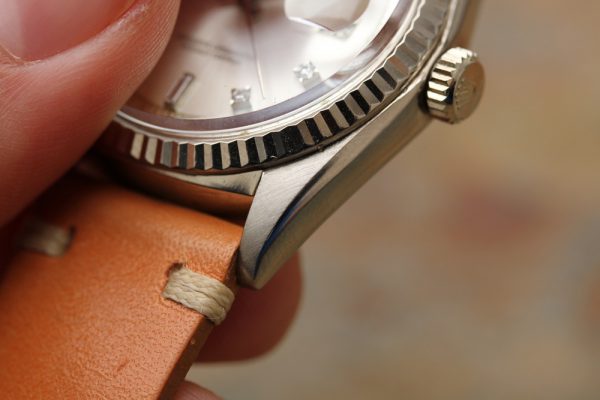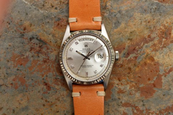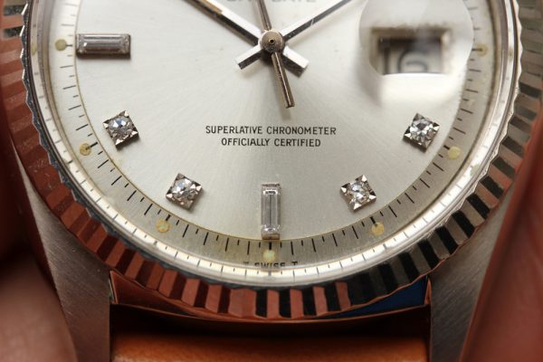 Dial is original, silver with round and baguette diamonds. No refinish, no relume, and factory setting on diamonds. Original hands with matching patina on the dial. Original date disk with open 6’s and 9’s.