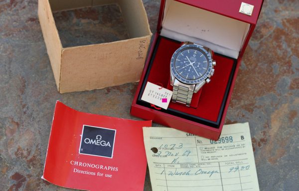 Watch comes with Omega box with original outer sleeve. Sleeve has 145.022 written on it, operating manual printed in ’69, original and matching Omega hangtag with printed matching serial number to the watch, and a sales receipt from November 2, 1969 for the amount of $99