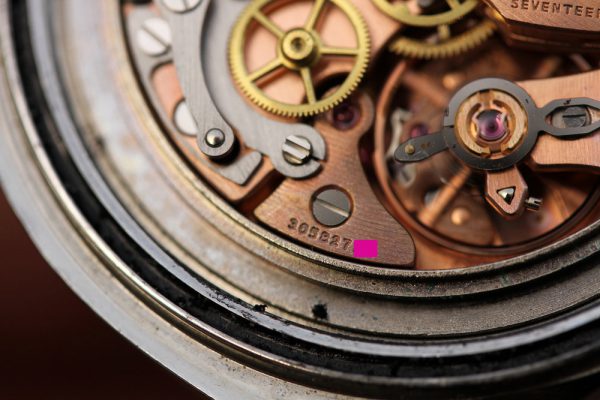 The movement is very clean, there are no service marks on inside of caseback and all screws on movement appear to be like new, no tool marks. I have purchased this watch from a gentleman who has owned it in private collection since the 1990’s and it sat in safe most of that time.
