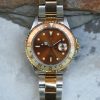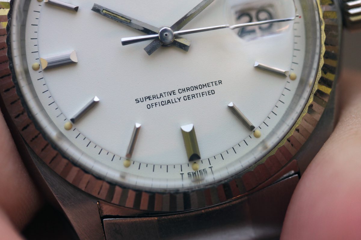 Dial is original pie-pan white with fully intact tritium plots and yellow patina. Original hands with matching patina. Date disk with open 6’s and 9’s.