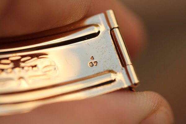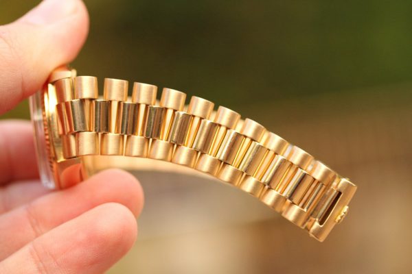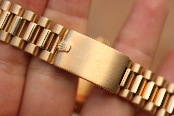 Bracelet is a Rolex President in yellow gold, fits a large wrist. Clasp is dated 4/67, shows moderate stretch from use.