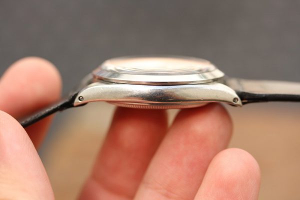 The dial is original, in excellent and damage free condition with beautiful cream patina on plots. The hands are original to the watch, but when the watch was found, have aged to a very dark, almost black color of patina. The hands were matched by LA Watchworks for better to the beautiful dial for better esthetics. There is an oil spot on edge of dial between 4 and 6 o’clock.