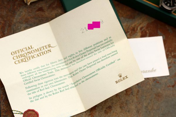 Watch comes as a complete set with Rolex boxes, wallet, punched COSC cert, punched Guarantee, COSC tag, and original hang tag with matching serial number.