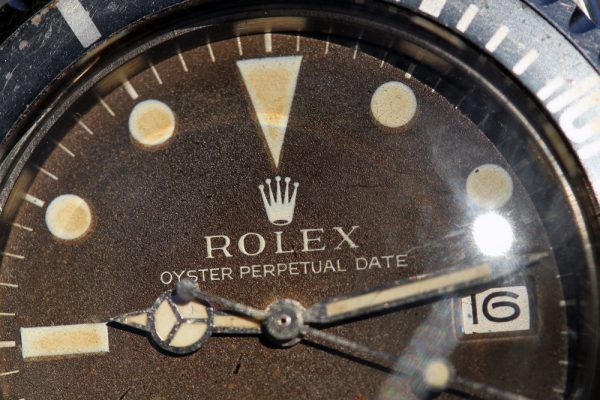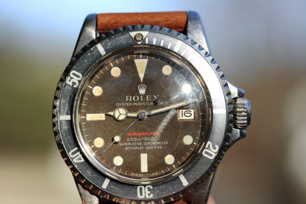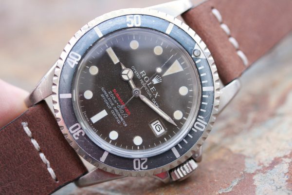 Dial is original MK2 with very attractive color change which is clearly visible both under shade as well as under direct sunlight. The first 2 pictures are taken outside, under a shade without any artificial lighting. The other pictures are taken outside, in direct sunlight, without any artificial lighting. The dial show no chipping, no drag marks, no damage and no refinish. Luminous material is still partially intact on plots and has aged to a nice color patina. Original date disk with open 6’s and 9’s and tritium hands with matching patina to the dial.