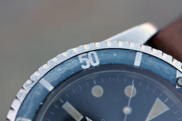 Extremely attractive bezel insert with very fat font and long 5 kissing the 0. The insert has aged to a grayish-blue hue.