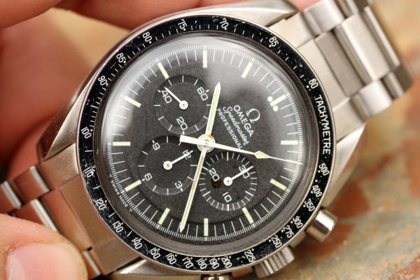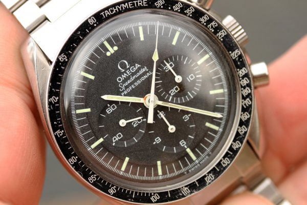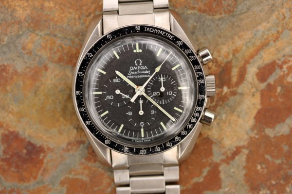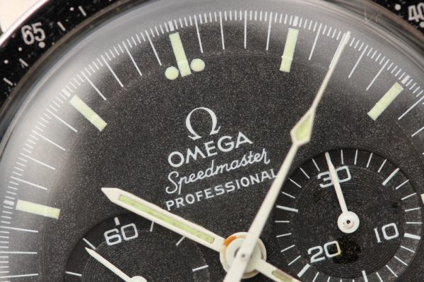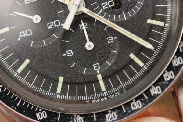 Dial is in excellent vintage condition, step, tritium. Nice patina on plots and original hands. The dial has aged to a grayish color evenly. There is what appears to be an oil spot on minute counter, this is only visible under certain angle and could possibly be cleaned up. The winding crown is Omega signed.