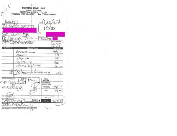 Furthermore, a copy of service receipt in his name from 2004 is also included where watch has received a full overhaul from a Canadian jeweler.