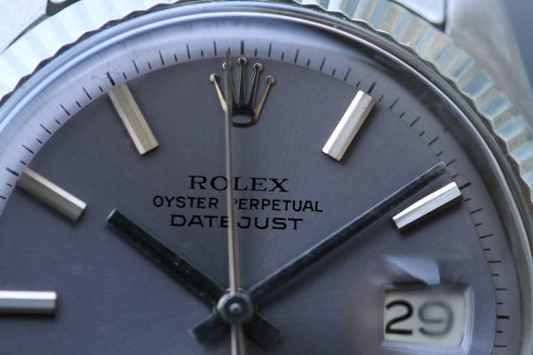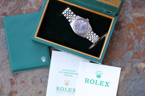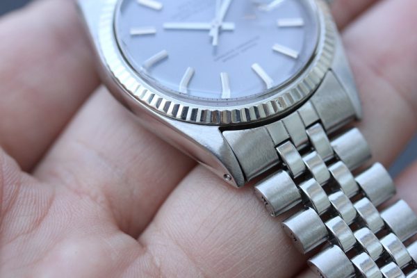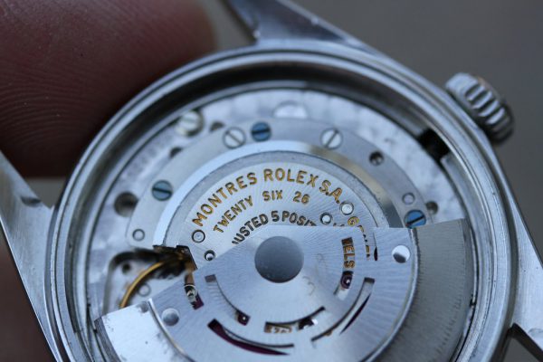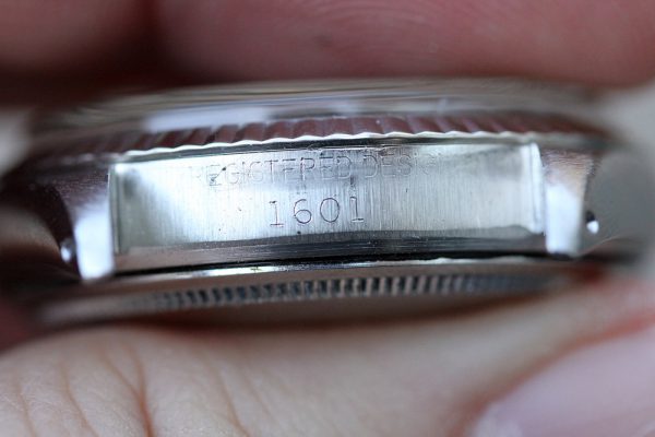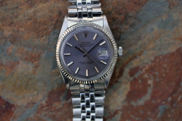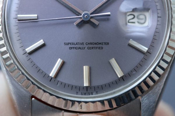 Dial is original, non-luminous pie-pan in a very attractive and unusual color that’s a light purple with gray tone. Flawless condition without damage. Correct and original hands are also non-luminous. Original date disk with open 6’s and 9’s.