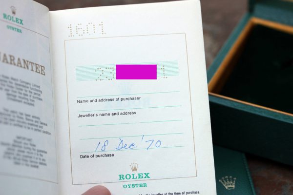 Watch comes complete with Rolex box, wallet, COSC paper with punched serial number as well as warranty booklet with punched serial number and 1601. Purchase date in December 1970.