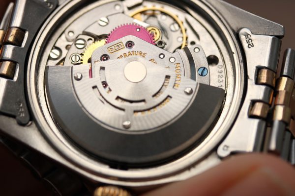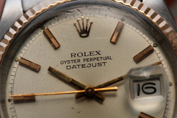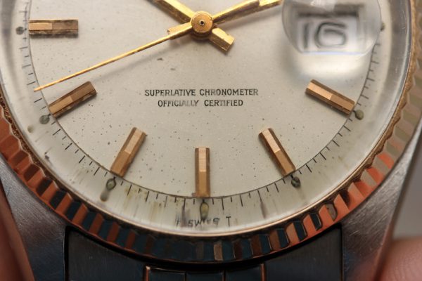 Dial is original, pie-pan with some spotting and other signs of aging. Rose gold plots and hands. Original date disk with open 6’s and 9’s.