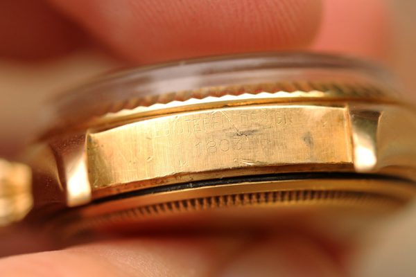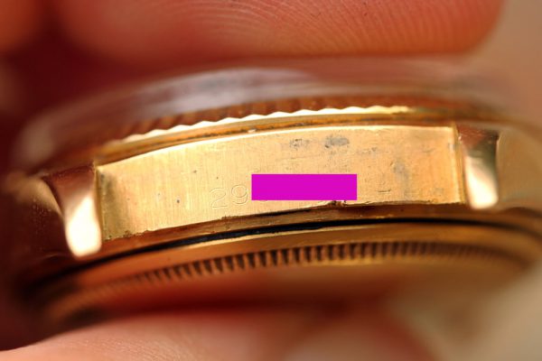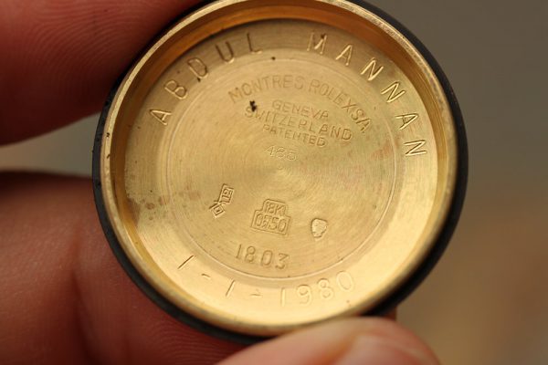 Caseback on this watch is interesting. The outside shows no personalization or engraving. The inside is stamped with normal 1803 and hallmarks, but then also stamped with a name and date. Please note this name and date are stamped inside of the caseback, not just engraved there and also the font style of numbers and the letters are similar/same as the factory stamps of 1803 and Rolex hallmarks. Doing very brief research, the only matches that came up were a politician in Bangladesh with that name who joined the Bangladesh Nationalist Party in 1980 and perhaps they had an special order from Rolex and these watches were given out as gifts or such. This is all just speculation and guesses, I am putting no premium at all on value of this watch as there is no provenance of solid proof.