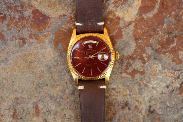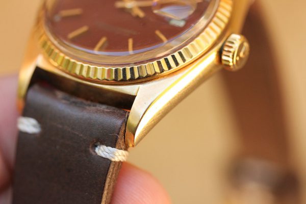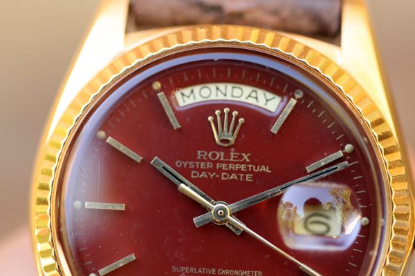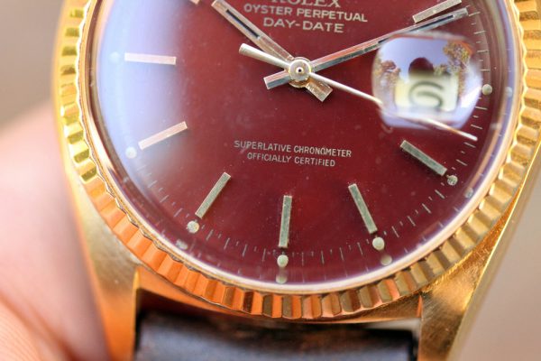 Dial is original, “stella” lacquered dial in Ox Blood color. Dial is free of cracks, scratches, chips, etc. Most of the lume dots are intact, but not perfect. Original date disk with open 6’s and 9’s.