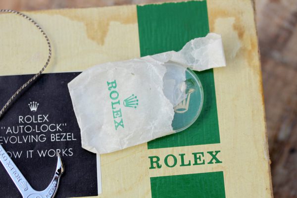 Watch comes very complete with original Rolex boxes, manual with AD stamp on back, hang tags with matching serial number, original 660ft anchor, original Rolex warranty papers with punched serial number. The original owner also saved the factory crystal from when it was swapped to a new one. Presumably, this was done at same time when the bracelet was updated in 1988 as well.