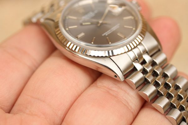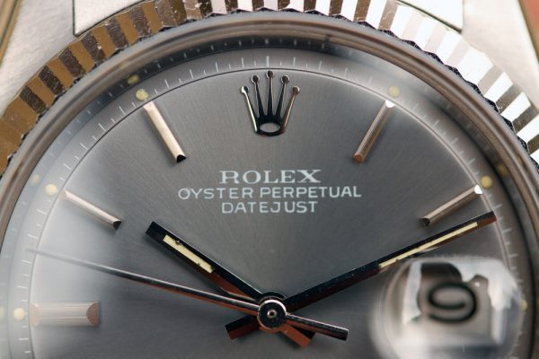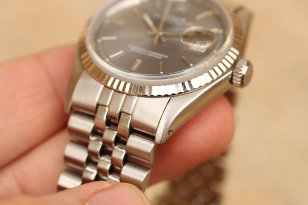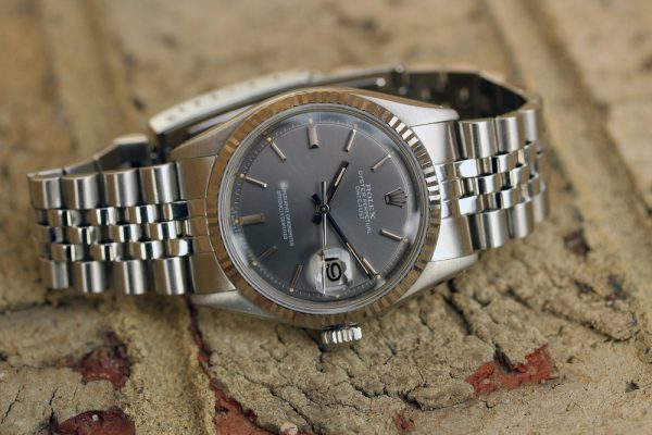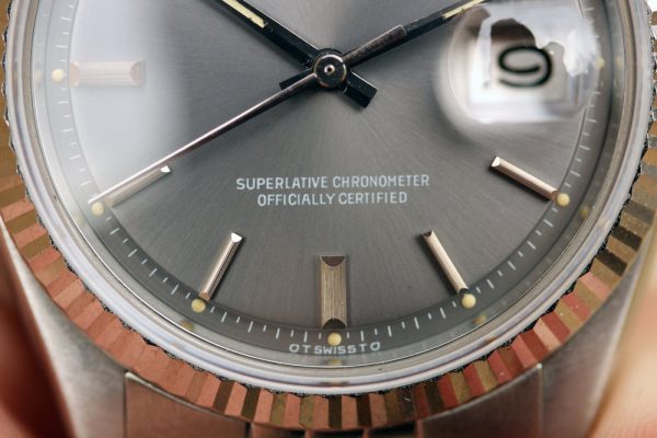 Dial is original, step, gray with white print and very nice patina on plots and hands. No relume, no refinish. Date disk with open 6’s and 9’s.
