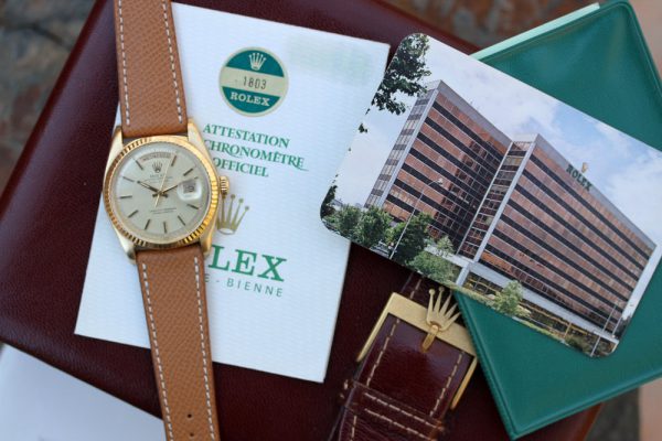 up for grabs is a Rolex Day-Date in 18kt yellow gold