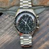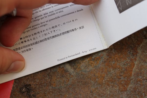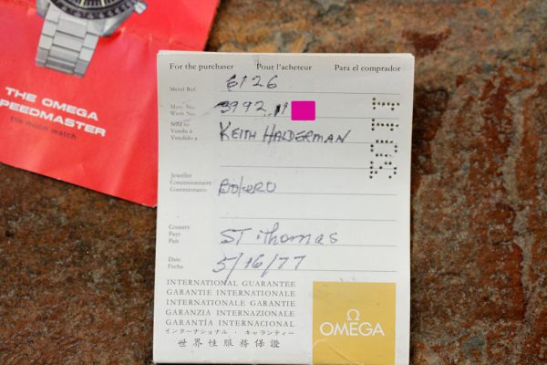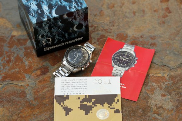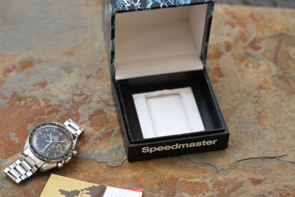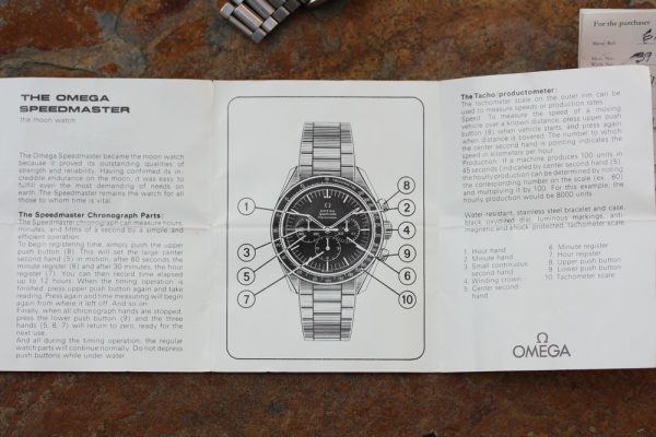 The watch comes with its original cube moon box (missing insert), original Speedmaster manual booklet and original warranty booklet which is signed and dated with matching serial number to the watch.