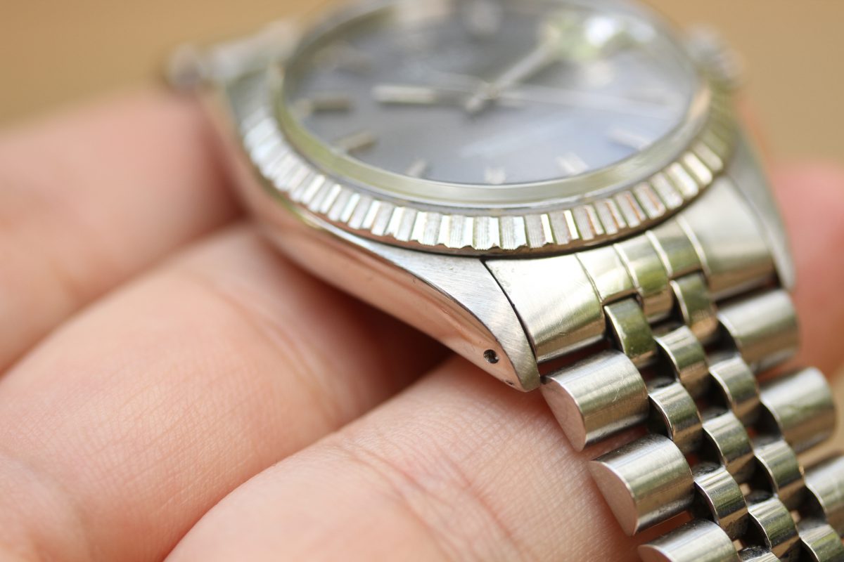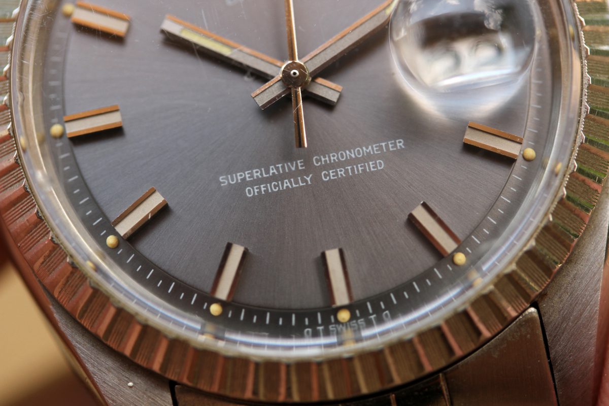 Dial is original, very attractive rhodium with perfect plots, sigma signed, “Wide Boy” markers. Original and matching wide boy hands.