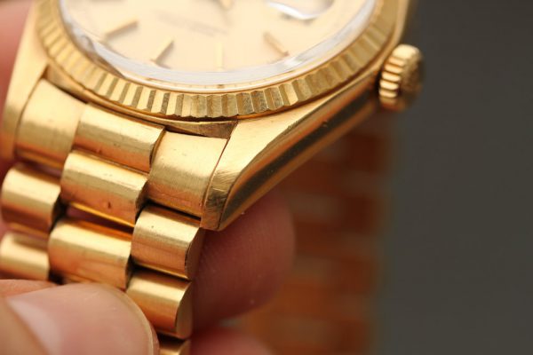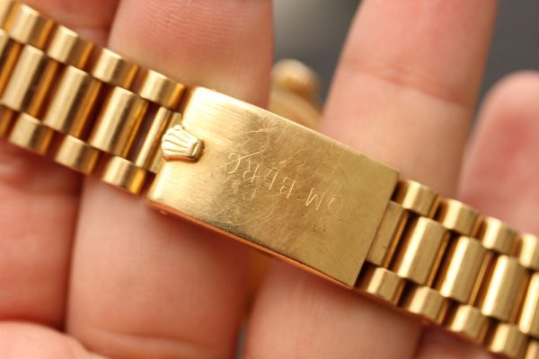 Bracelet is original Rolex President with full length bracelet, moderate stretch from use. The clasp has personalized engraving on outside. Correct date code A on clasp and original 53 end-links.