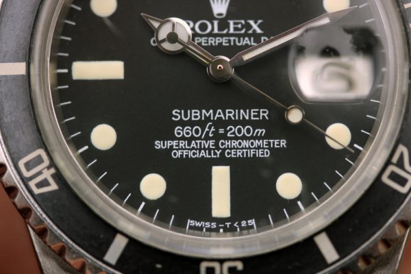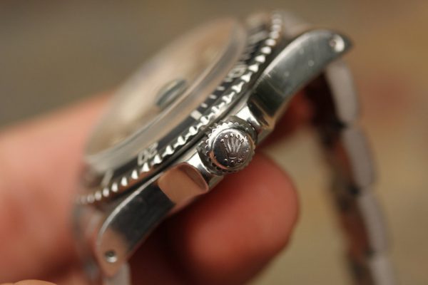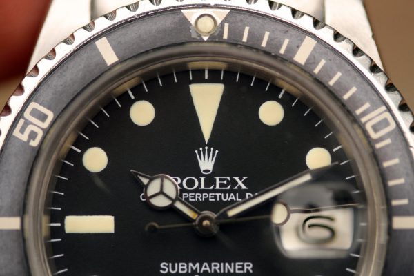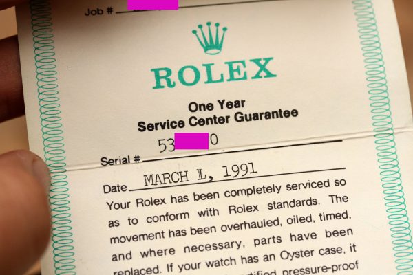 Dial is original with cream patina on plots. Damage free. Hands are tritium, but were replaced in 1991 during service, so aged to lighter color than dial. Rolex service warranty card and receipt are included with matching serial number. Date disk remains original with open 6’s and 9’s.