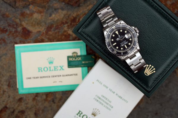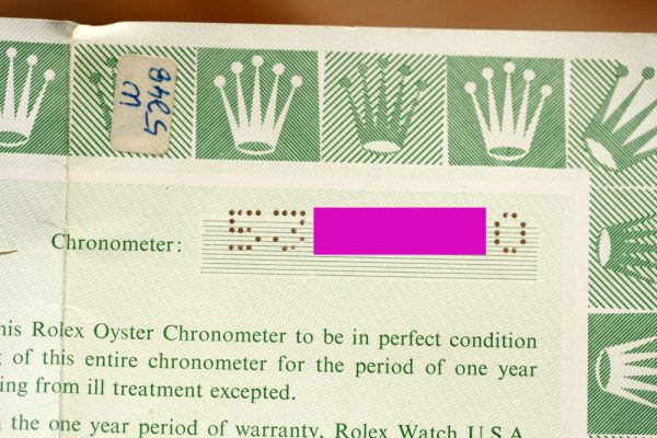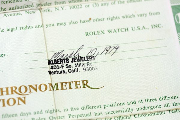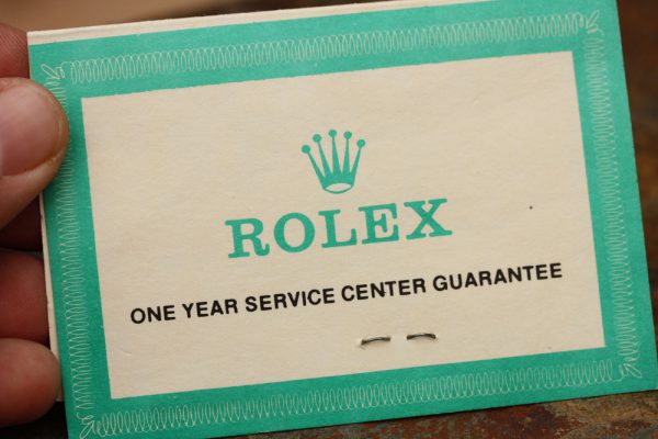 Watch comes complete with Rolex box, warranty papers which are punched, AD stamped and dated at time of purchase in 1979. The watch left Rolex to the AD in 1978 as stamped on outside of papers. Also included is before mentioned Rolex Service Center warranty paper and receipt. Hang tag is included, but sticker came off.