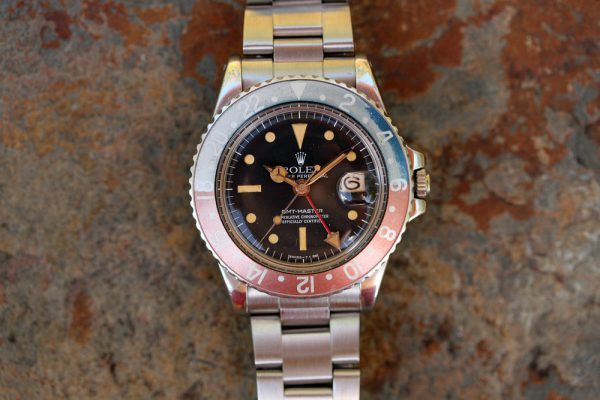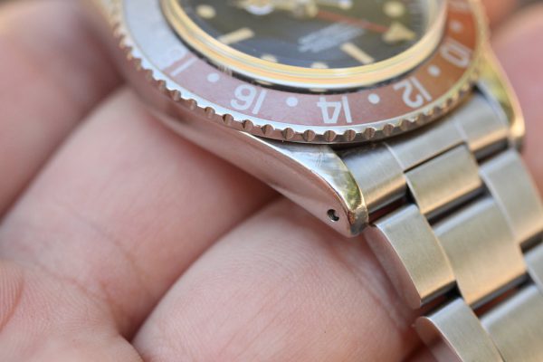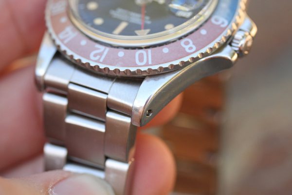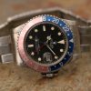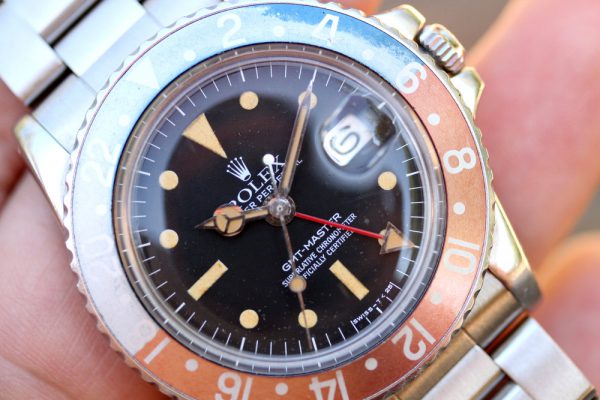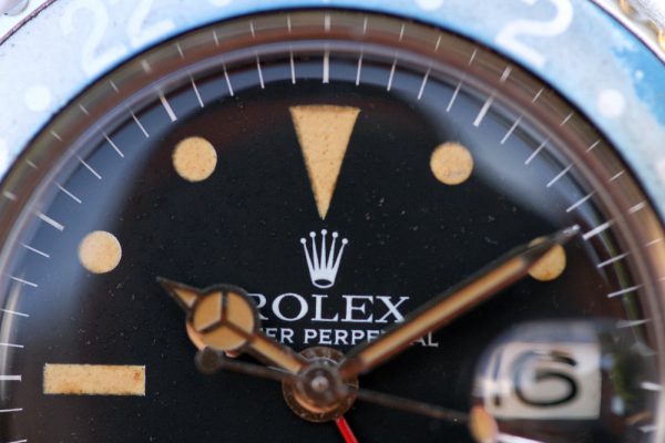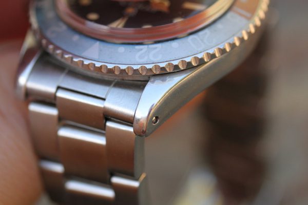 Bezel insert is original fat font with red back. The red side has aged to a brown/burnt orange hue and blue has faded to a pale blue color.