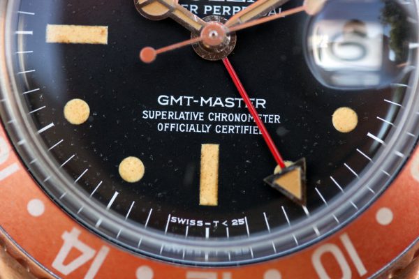 Dial is original, “radial” or “mini” with orange patina. Dial is free of chips or scratches, and shows aging in forms of spotting throughout. Hands are relumed to color match the dial. Original date disk with open 6’s and 9’s.