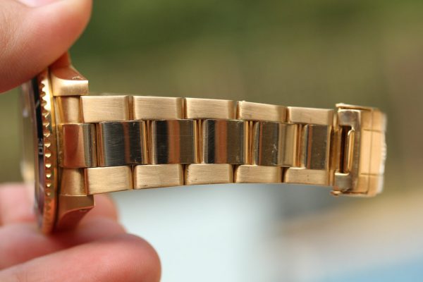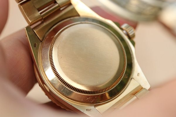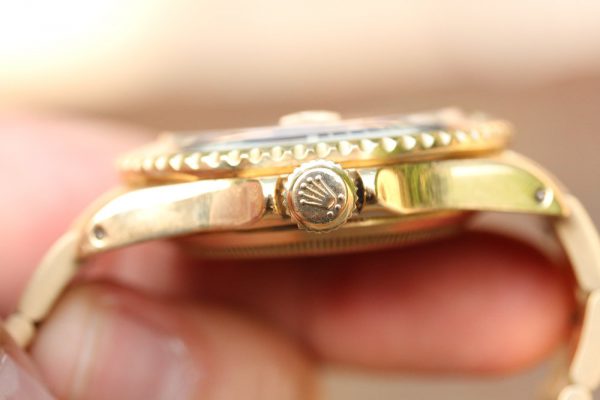 Dial is an interesting one. It is obviously original, with original tritium “nipple” marks and matching tritium hands. The original color, which only came in black or blue for this reference, is no longer there. I do not believe this dial changed to this caramel kind of color, but rather the blue paint has peeled off as we see partially happen on dials from this era on Subs and GMT’s and what we have the is base color with original print still fully intact. I see no evidence of this being done by someone with a tool, but rather happen on its own, from age. It is quiet attractive in person. Original date disk with open 6’s and 9’s.