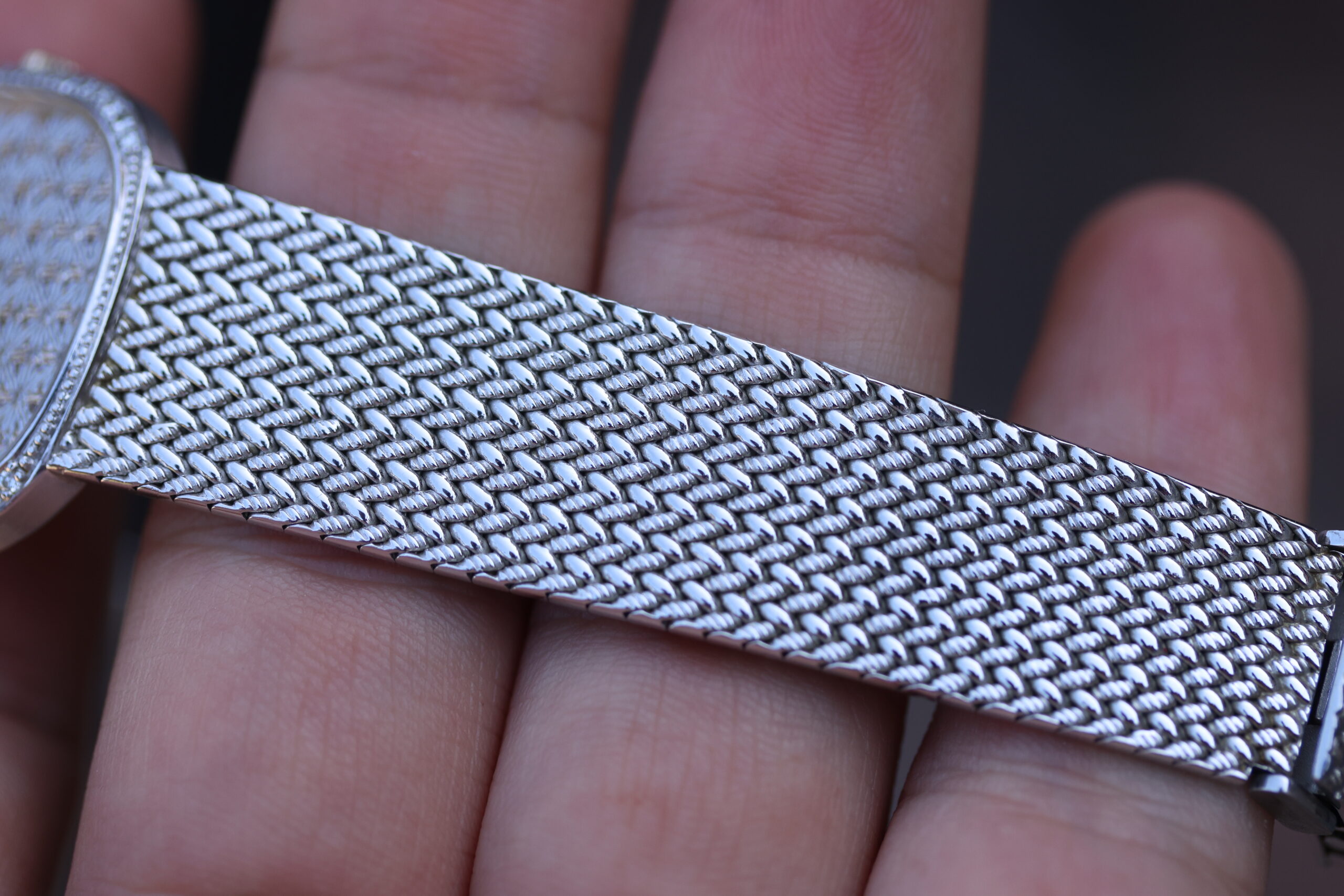 The woven integrated white gold bracelet is in excellent condition and total length measures 7.25″ including the watch’s head. The clasp is signed and stamped.