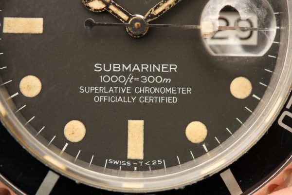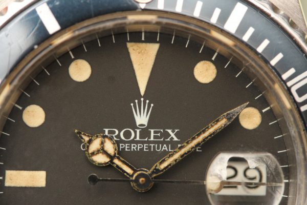 Dial is original, matte with very attractive heavy cream patina on all plots and original hands. The dial has color change happening but I will not call it “tropical”, but its clearly not black anymore, either. There is a spot on dial by 11 oclock. The hands are original with some oxidation on metal parts. No relume, no refinish. Original date disk with open 6’s and 9’s.