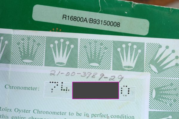 Watch comes complete with Rolex box, warranty paper and hang tag with matching serial number.